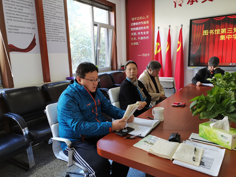10月15日上午图书馆第三党支部围绕“不忘共产党人的初心,牢记共产 党人的使命,全心全意为人民服务!”开展主题教育集中学习,第三支部全体党员参加此次学习。