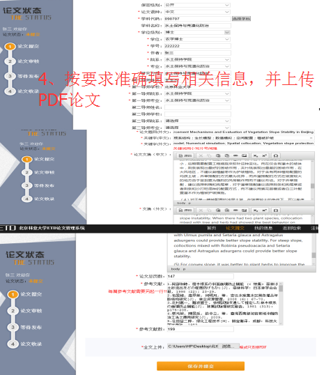 涉密论文在保密级别处选择保密,“上传原文”的原文为封面、独创声明、中英文摘要及关键词部分,然后凭学校相关部门审核过的<北京林业大学研究生学位论文保密申请表>复印件领取回执。