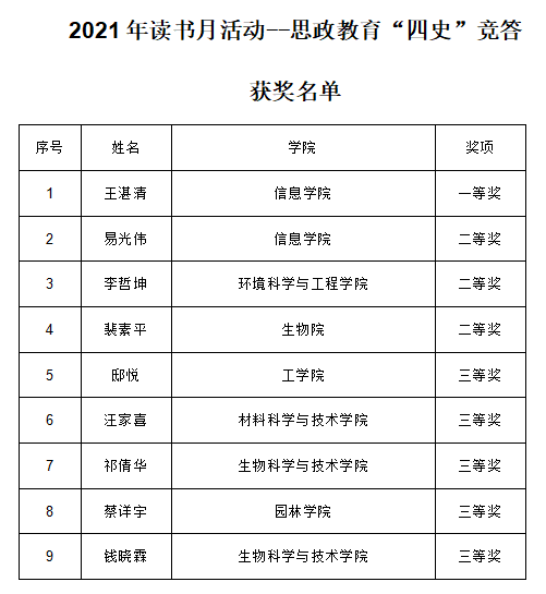 活动得到了读者的积极参与,经过20天的学习与竞答,通过活动组委会评审产生了一等奖1名、二等奖3名、三等奖5名(获奖名单附后),并于2021年5月27日在图书馆三层会议室为获奖人员颁发奖品和荣誉证书。