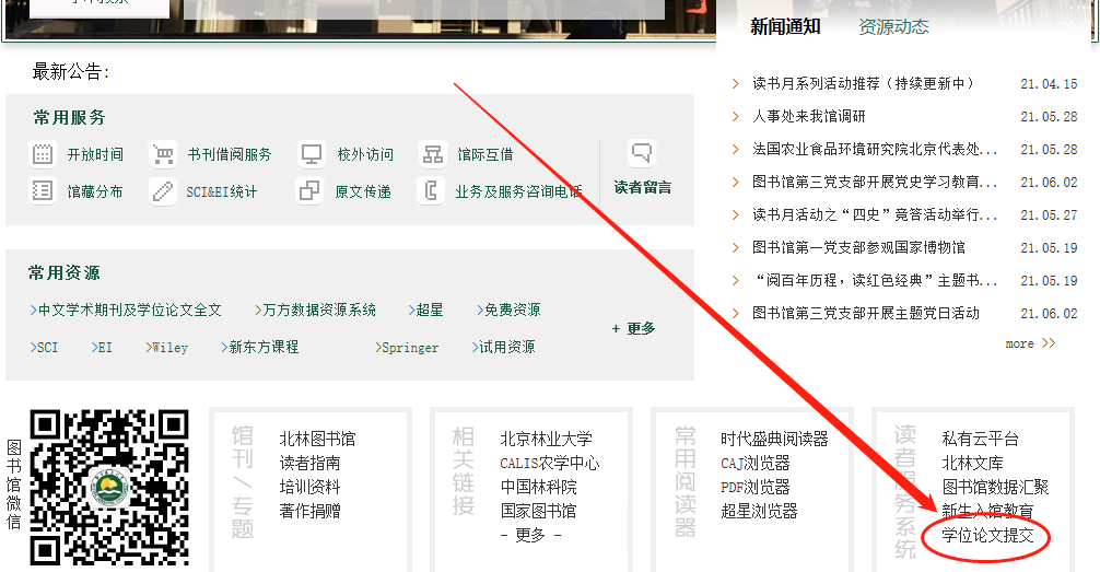 1、首先,图书馆主页—“读者服务系统”--“学位论文提交”