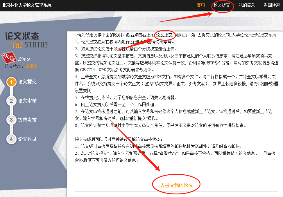 2、进入北京林业大学论文管理系统,点击“论文提交”