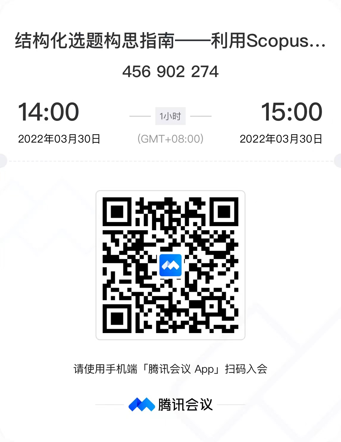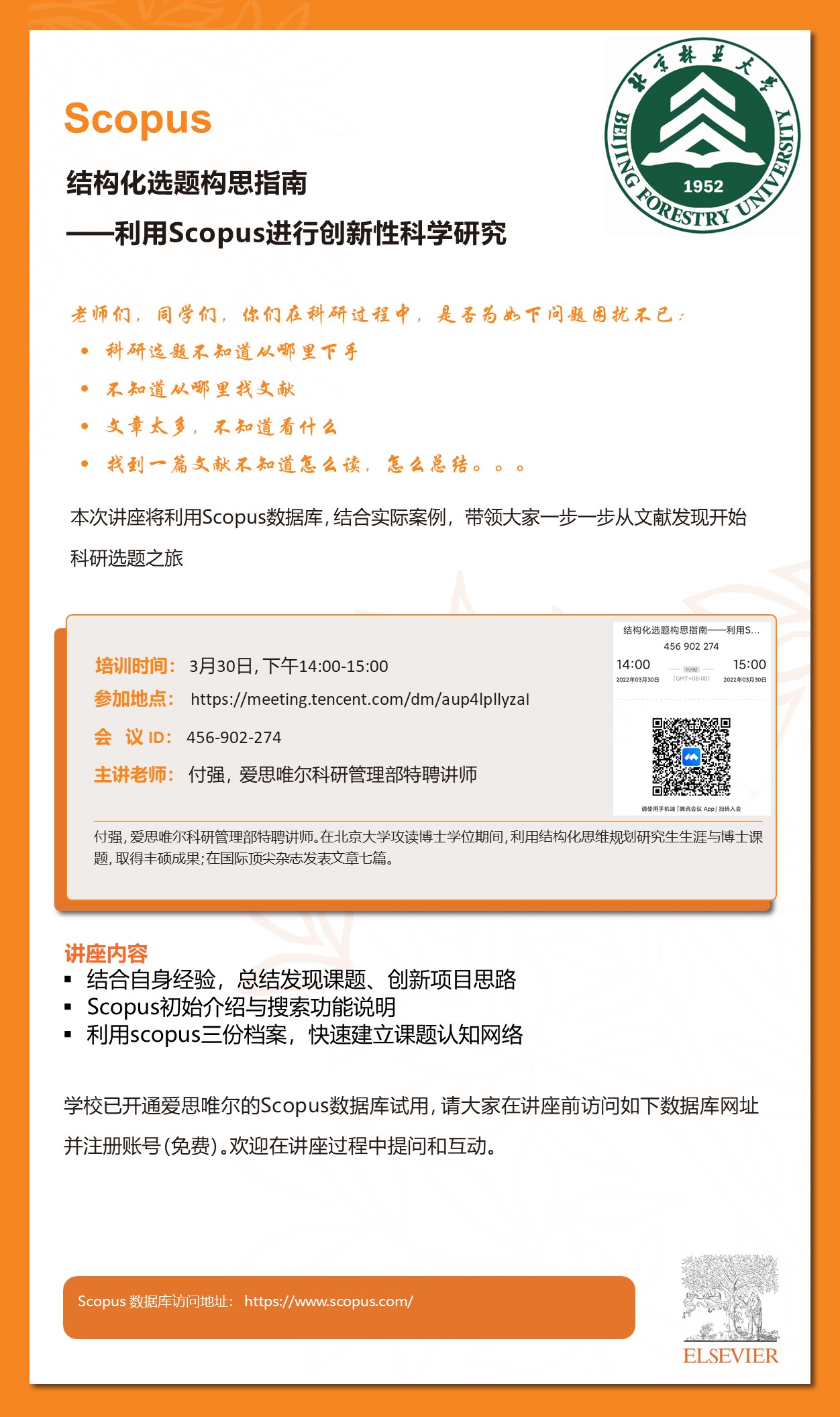 为进一步支持北京林业大学的科研信息服务,经双方友好协商,爱思唯尔现为北京林业大学开通Scopus数据库的免费试用。同时,为了更好地利用SCOPUS数据库,2022年3月30日下午2:00-3:00进行北京林业大学专场培训讲座,结合实际案例,带领大家一步一步从文献发现科研选题之旅!欢迎扫描下方图中二维码或者输入腾讯会议号456-902-274提前加入。