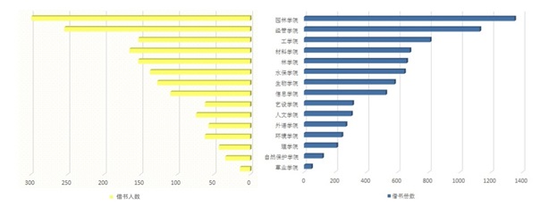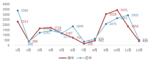 全年借还图书35960册,借还高峰期在1月、9月、10月和11月。其中借阅图书17324册,借阅人数3581人,人均借阅量为4.84本。借阅量最大的在401借阅室,其次是301借阅室、302借阅室等。