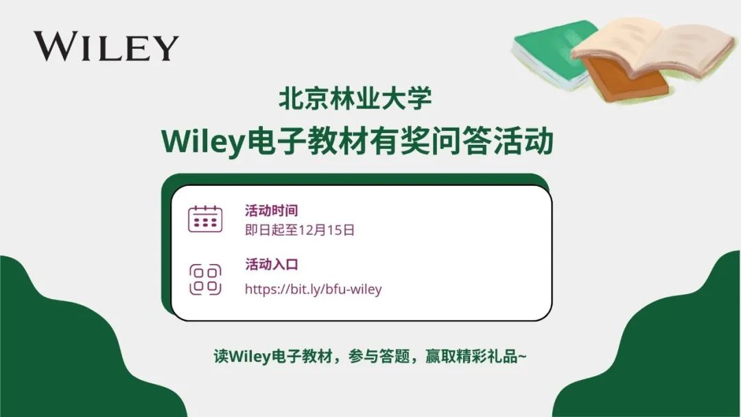 为了鼓励大家充分利用Wiley的优质电子教材资源,北京林业大学图书馆联合Wiley出版社特别企划了有奖问答活动。只需简单几步参与活动,就有机会获得精美礼品哦!