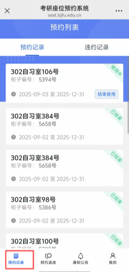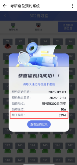 (4)预约成功后,系统将显示考研座位配备的存包柜号码,也可以在预约记录中查看。
