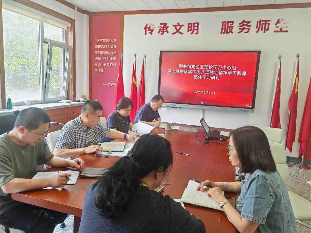 6月11日,图书馆党总支理论学习中心组围绕深入贯彻中央八项规定精神开展集体学习研讨。图书馆党总支理论学习中心组成员参加会议。